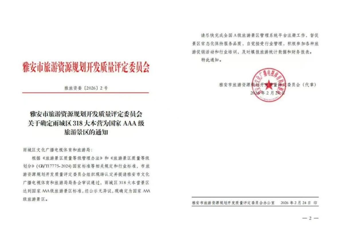 2月24日,經(jīng)雅安市文化廣播電視體育和旅游局局務(wù)會(huì)審議通過,中國·雅安318自駕大本營正式被確定為國家AAA級(jí)旅游景區(qū)。