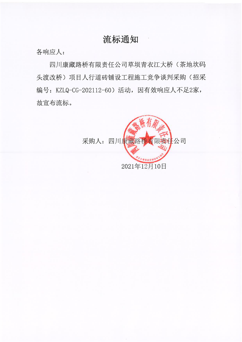 四川康藏路橋有限責任公司草壩青衣江大橋(茶地坎碼頭渡改橋)項目人行道磚鋪設(shè)工程施工競爭談判采購流標通知
