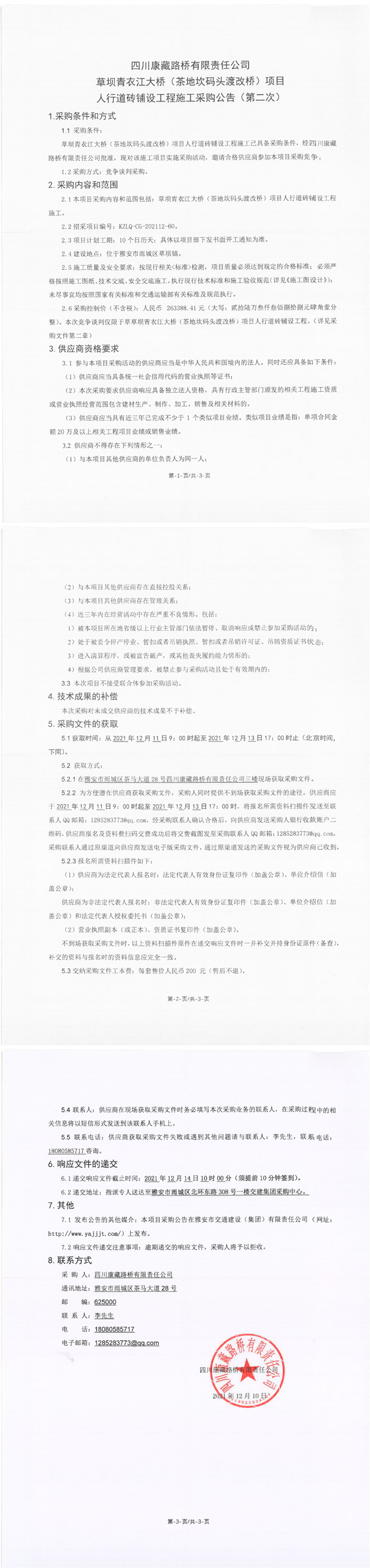 四川康藏路橋有限責任公司草壩青衣江大橋(茶地坎碼頭渡改橋)項目人行道磚鋪設工程施工采購公告(第二次)
