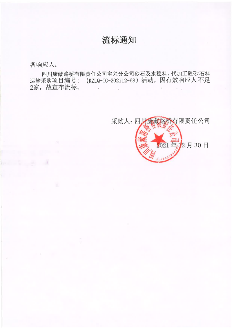 四川康藏路橋有限責(zé)任公司寶興分公司砂石及水穩(wěn)料、代加工砼砂石料運(yùn)輸采購流標(biāo)通知