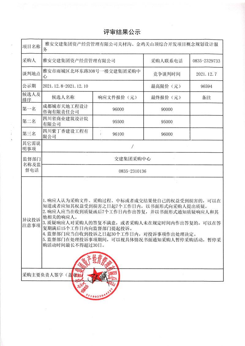 雅安交建集團(tuán)資產(chǎn)經(jīng)營(yíng)管理有限公司關(guān)材溝、金雞關(guān)山頂綜合開發(fā)項(xiàng)目概念規(guī)劃設(shè)計(jì)服務(wù)評(píng)審結(jié)果公示