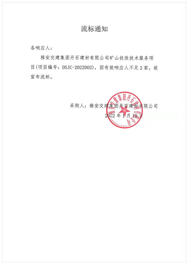 雅安交建集團(tuán)丹石建材有限公司礦山技改技術(shù)服務(wù)項目流標(biāo)通知