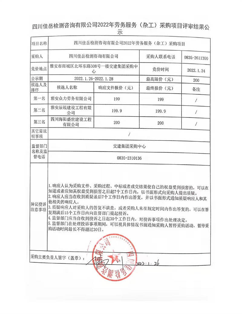 四川佳岳檢測咨詢有限公司2022年勞務服務(雜工)采購項目評審結果公示