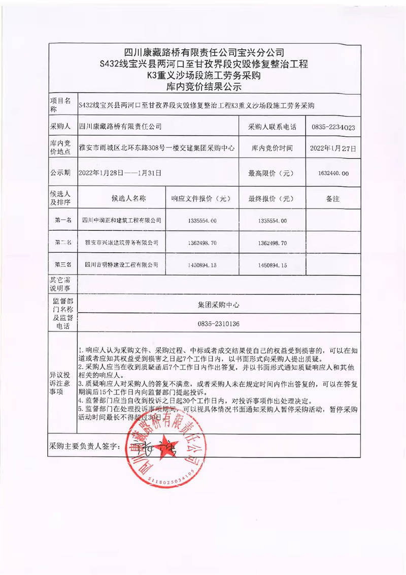 四川康藏路橋有限責任公司寶興分公司S432線寶興縣兩河口至甘孜界段災毀修復整治工程K3重義沙場段施工勞務采購庫內競價結果公示
