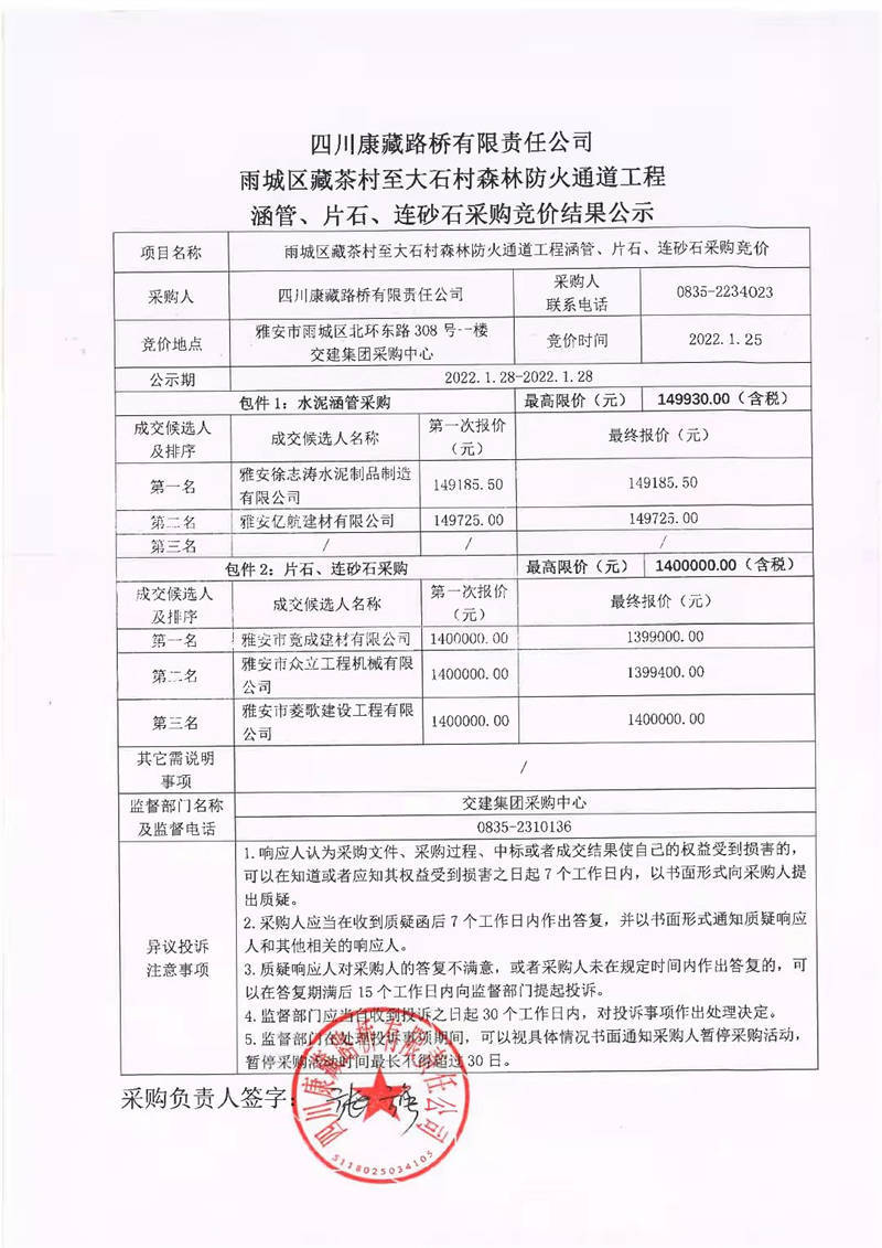 四川康藏路橋有限責(zé)任公司雨城區(qū)藏茶村至大石村森林防火通道工程涵管、片石、連砂石采購(gòu)競(jìng)價(jià)結(jié)果公示
