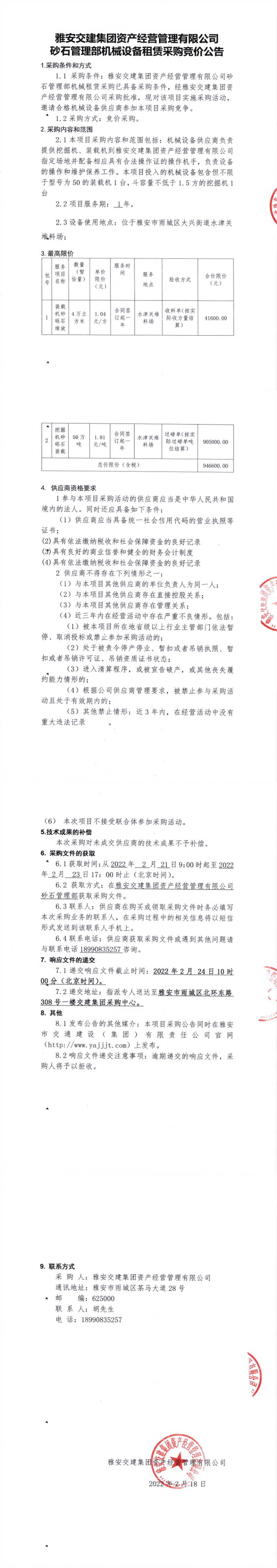 雅安交建集團資產經(jīng)營管理有限公司砂石管理部機械設備租賃采購競價公告