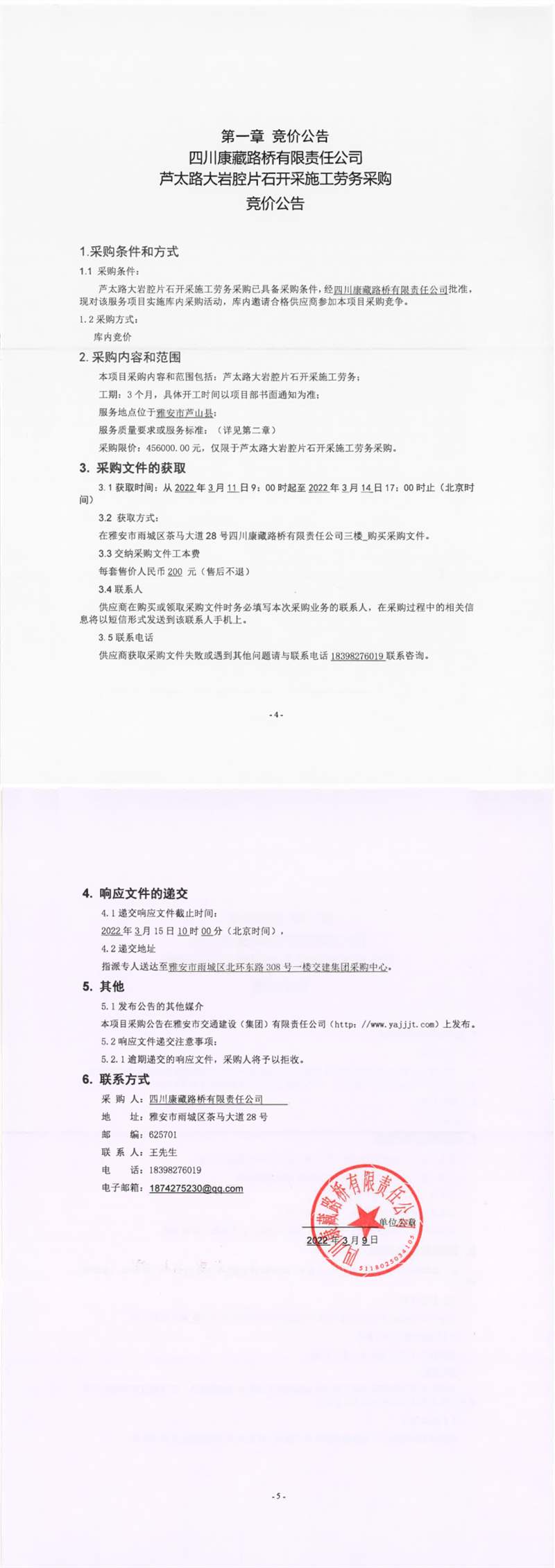 四川康藏路橋有限責任公司蘆太路大巖腔片石開采施工勞務采購競價公告