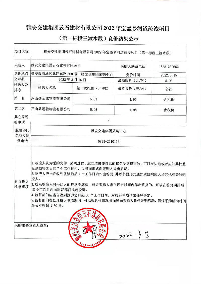 雅安交建集團(tuán)云石建材有限公司2022年寶盛鄉(xiāng)河道疏浚項目(第二標(biāo)段紙廠頭段)競價結(jié)果公示