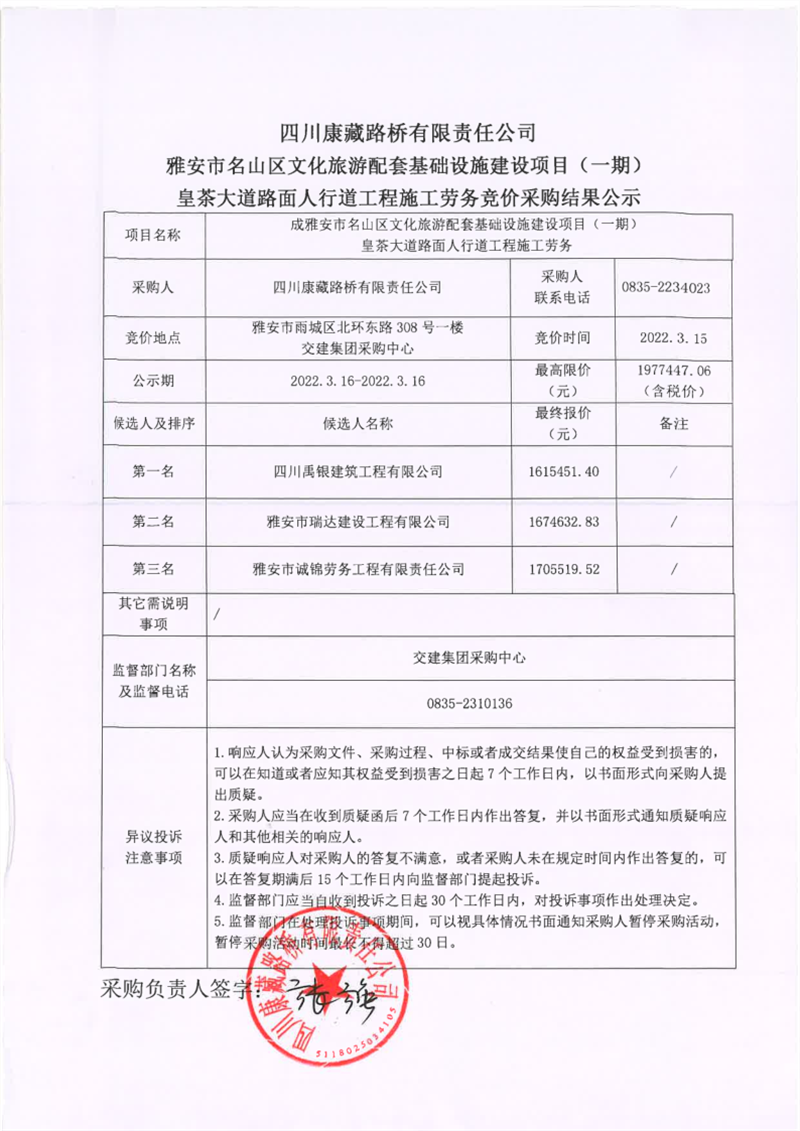 四川康藏路橋有限責(zé)任公司雅安市名山區(qū)文化旅游配套基礎(chǔ)設(shè)施建設(shè)項(xiàng)目(一期)皇茶大道路面人行道工程施工勞務(wù)競價(jià)采購結(jié)果公示