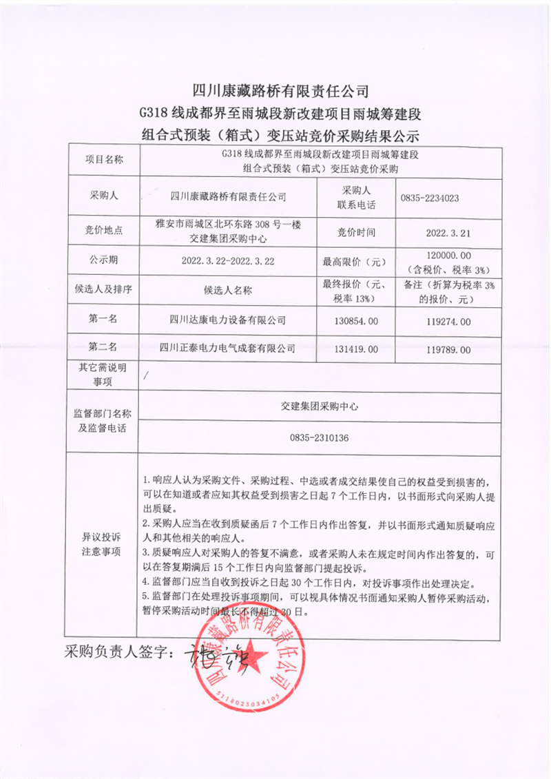 四川康藏路橋有限責(zé)任公司G318線成都界至雨城段新改建項(xiàng)目雨城籌建段組合式預(yù)裝(箱式)變壓站競價采購結(jié)果公示