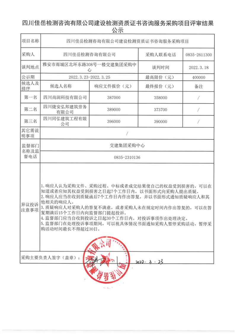 四川佳岳檢測(cè)咨詢有限公司建設(shè)檢測(cè)資質(zhì)證書咨詢服務(wù)采購(gòu)項(xiàng)目評(píng)審結(jié)果公示