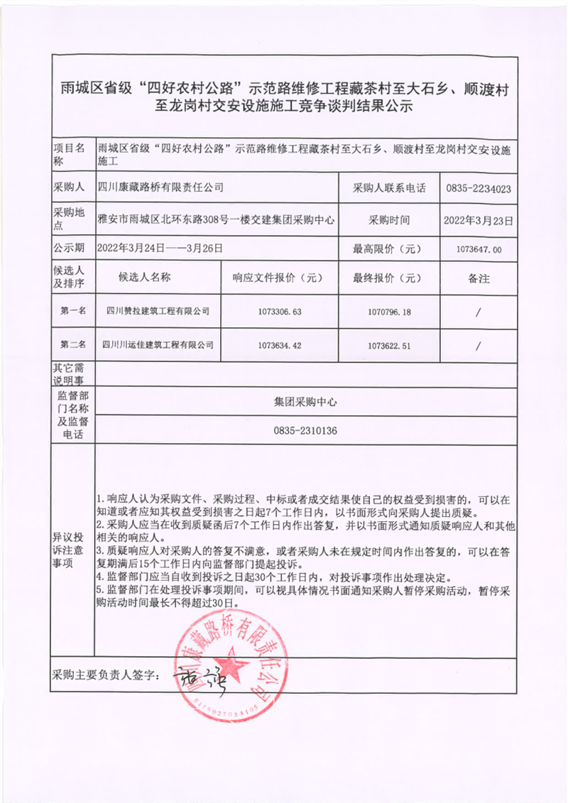 四川康藏路橋有限責任公司雨城區(qū)省級“四好農村公路”示范路維修工程藏茶村至大石鄉(xiāng)、順渡村至龍崗村交安設施施工競爭談判結果公示