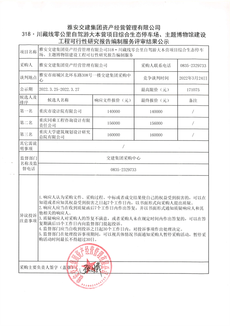 雅安交建集團(tuán)資產(chǎn)經(jīng)營管理有限公司318.川藏線零公里自駕游大本營項目綜合生態(tài)停車場、主題博物館建設(shè)工程可行性研究報告編制服務(wù)評審結(jié)果公示