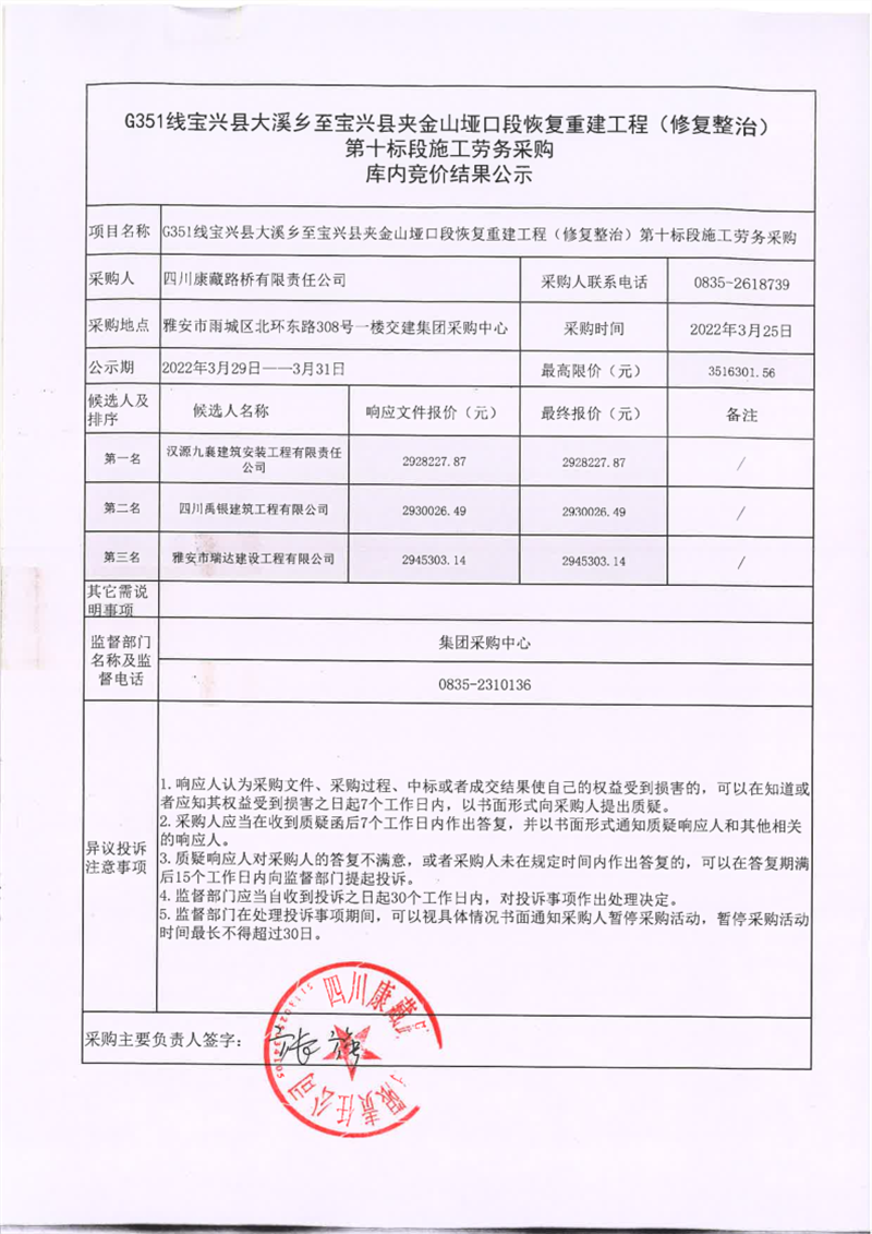 四川康藏路橋有限責任公司寶興分公司G351線寶興縣大溪鄉(xiāng)至寶興縣夾金山埡口段恢復重建工程(修復整治)第十標段施工勞務采購庫內競價結果公示