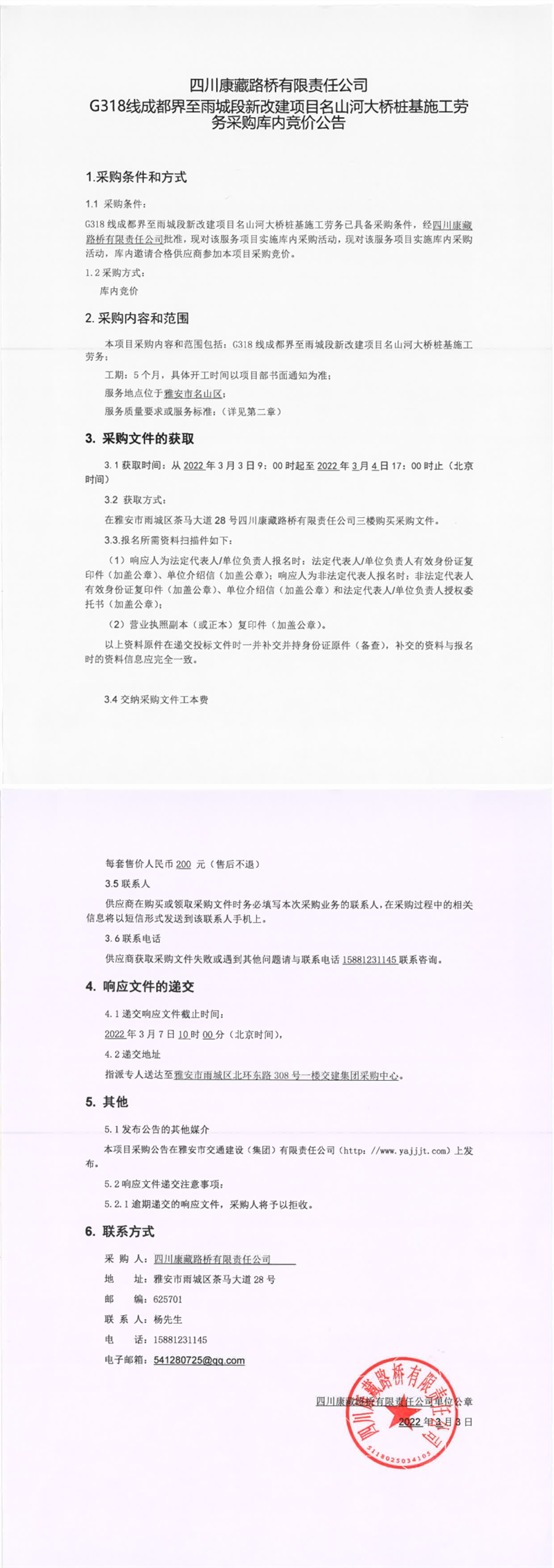 四川康藏路橋有限責(zé)任公司G318線成都界至雨城段新改建項(xiàng)目名山河大橋樁基施工勞務(wù)采購庫內(nèi)競價公告