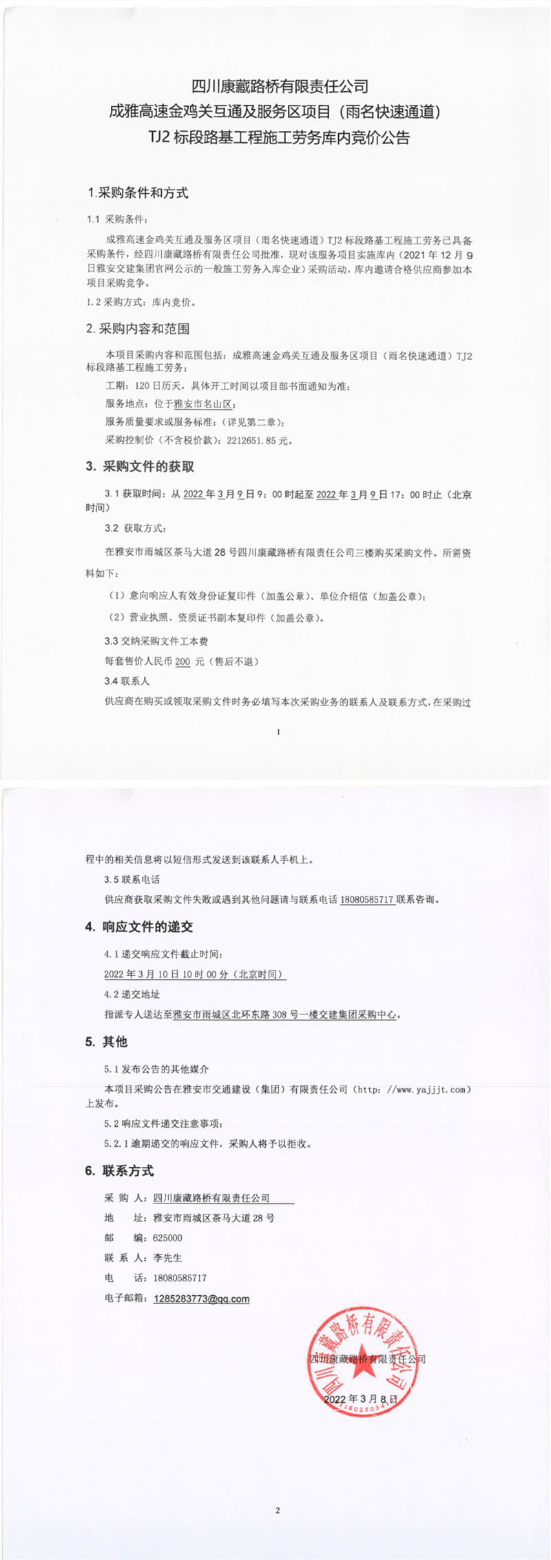 四川康藏路橋有限責任公司成雅高速金雞關互通及服務區(qū)項目(雨名快速通道)TJ2標段路基工程施工勞務庫內(nèi)競價公告