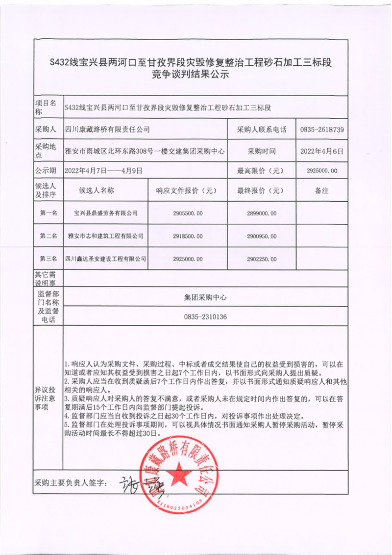 四川康藏路橋有限責任公司S432線寶興縣兩河口至甘孜界段災毀修復整治工程砂石加工三標段競爭談判結果公示