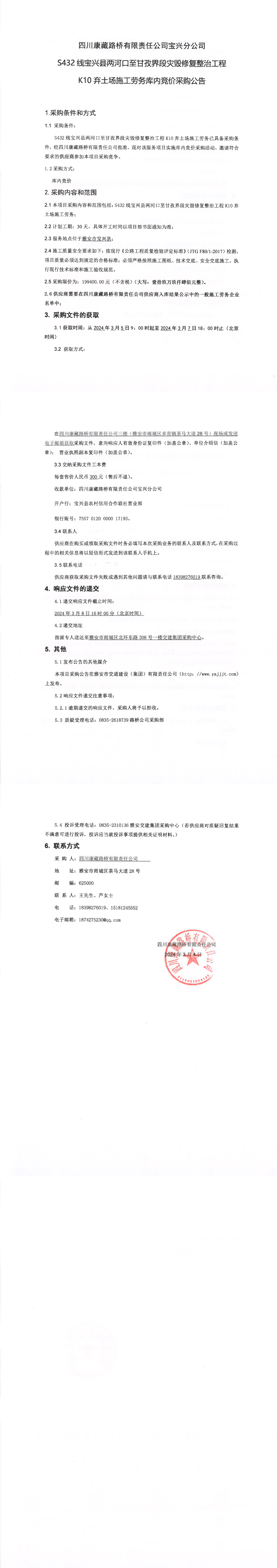 四川康藏路橋有限責任公司S432線寶興縣兩河口至甘孜界段災毀修復整治工程K10棄土場施工勞務庫內(nèi)競價采購公告