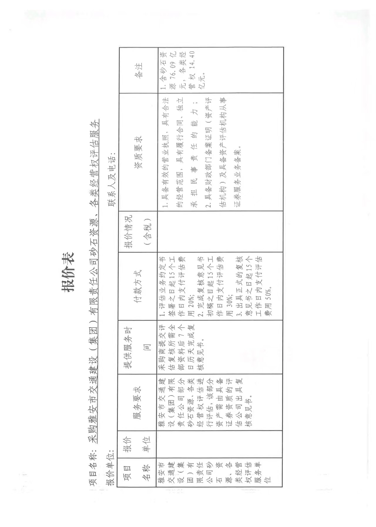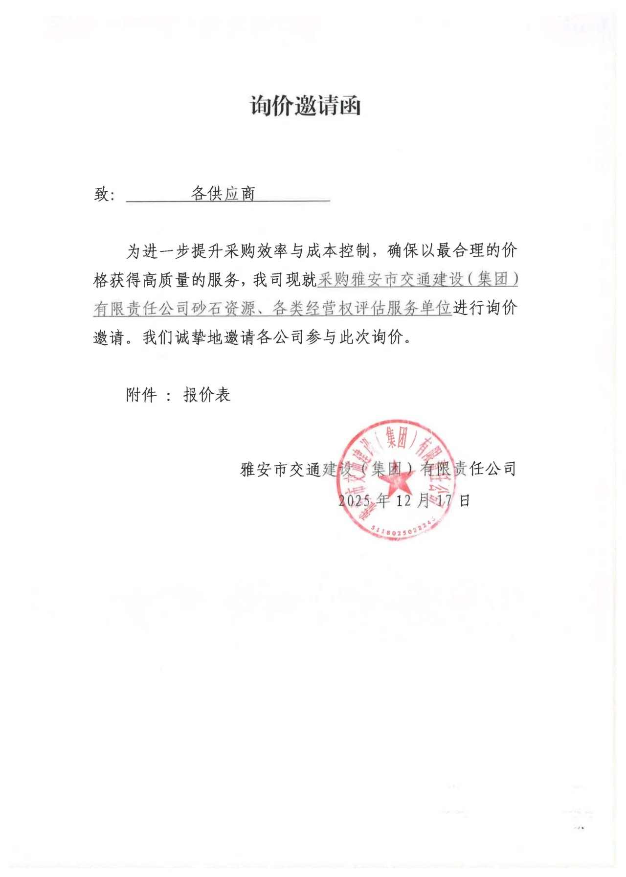 關(guān)于雅安市交通建設(shè)(集團(tuán))有限責(zé)任公司砂石資源、各類經(jīng)營權(quán)評估服務(wù)限價的詢價函