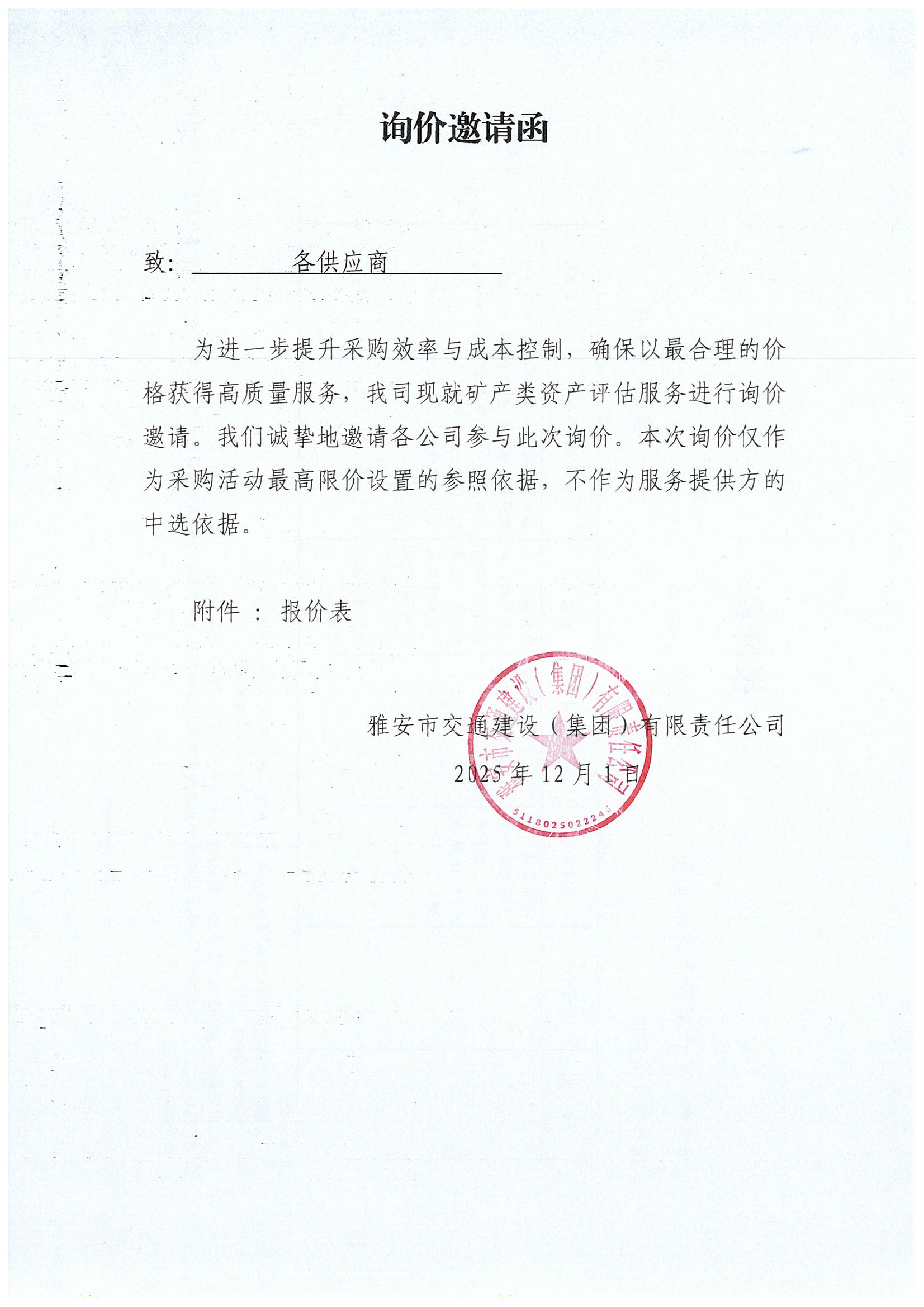 關(guān)于雅安市交通建設(shè)(集團)有限責(zé)任公司礦產(chǎn)類資產(chǎn)評估服務(wù)采購限價的詢價函