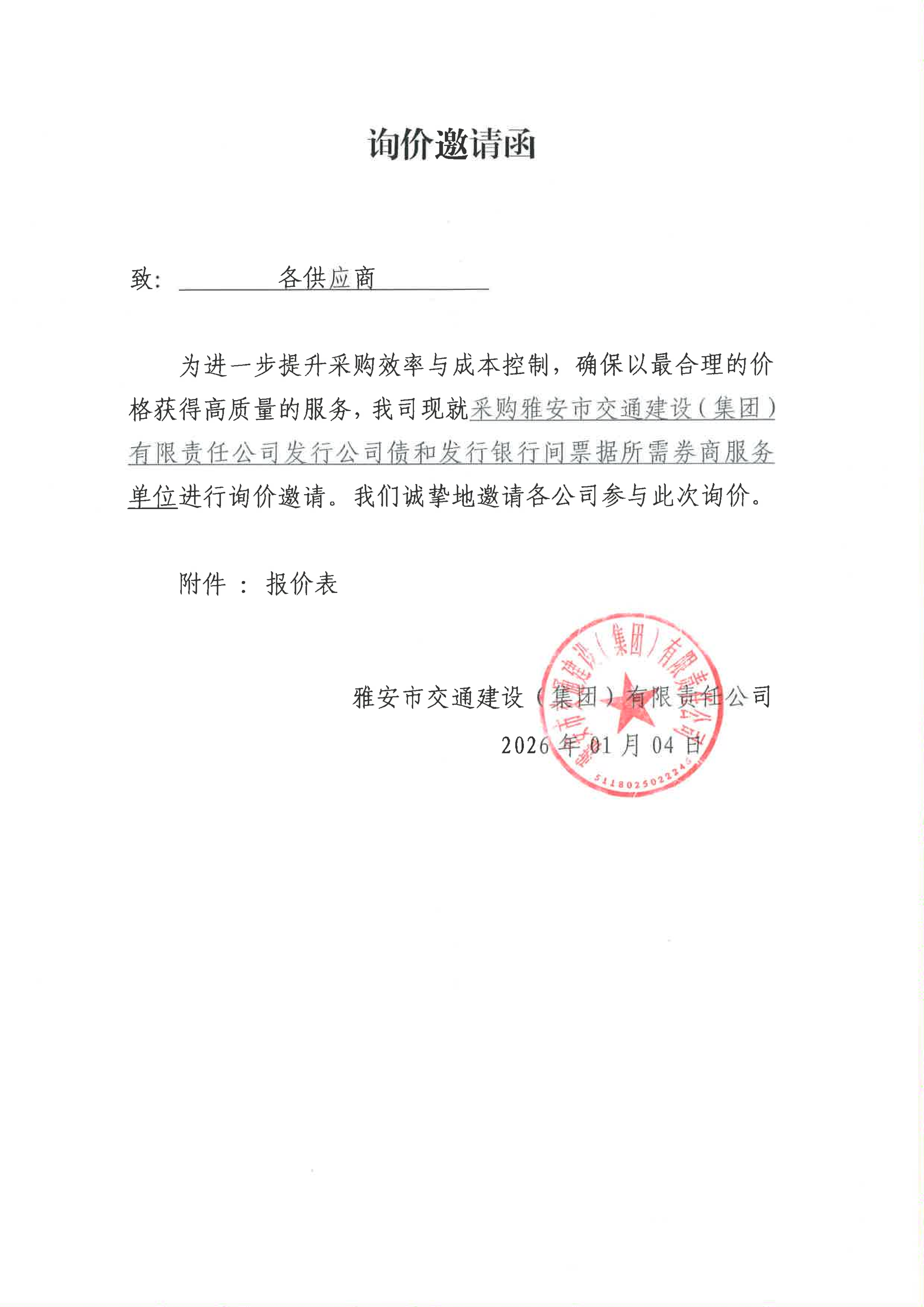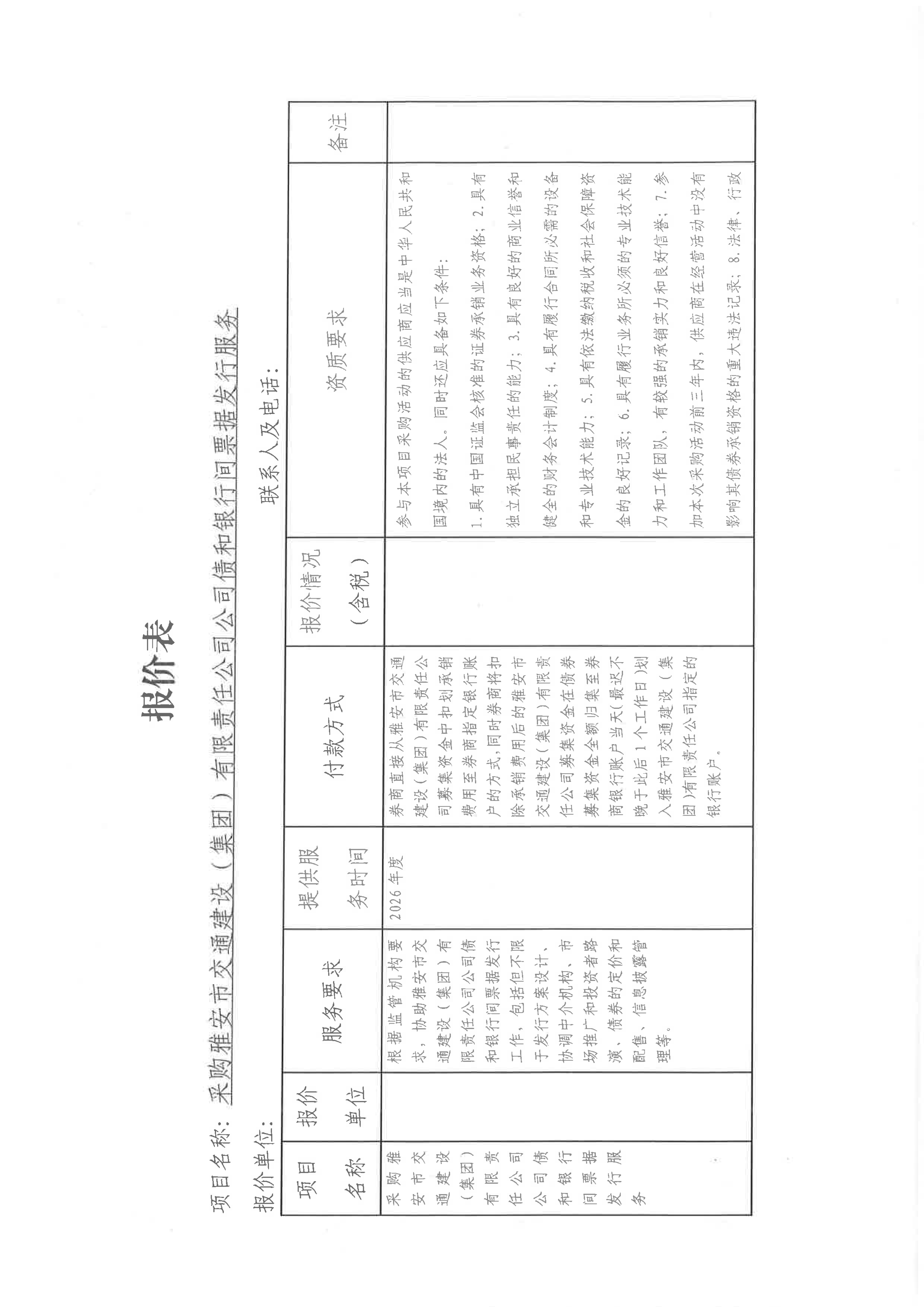 關(guān)于采購雅安市交通建設(shè)(集團(tuán))有限責(zé)任公司發(fā)行公司債和發(fā)行銀行間票據(jù)所需券商服務(wù)限價的詢價函
